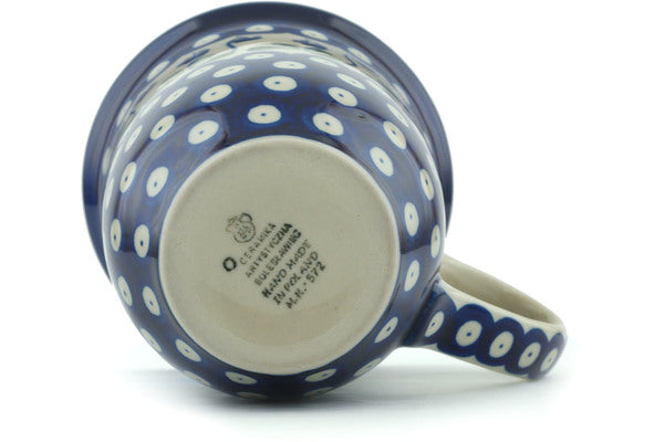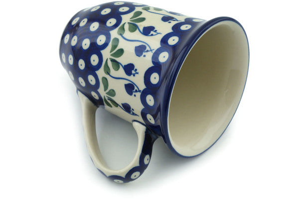 This Polish pottery Mug is made by Ceramika Artystyczna workshop in Boleslawiec, Poland. Manufacturer item number H3405I. It is 4¾" high and measures 5½" by 4¼". The capacity of this Mug is 16.6 oz when filled to rim and it weighs 1.1 lbs. The pattern was designed by artist Maria Ciszewska. It is part of the Bleeding Heart Peacock Collection.