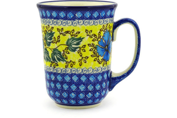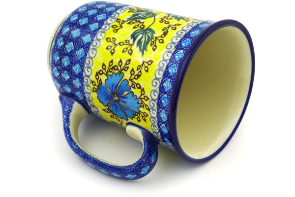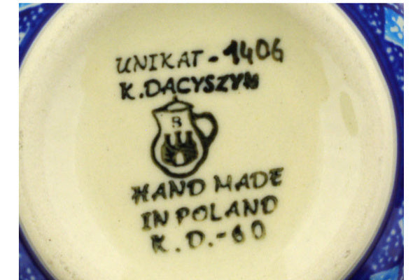 This Polish pottery Mug is made by Ceramika Artystyczna workshop in Boleslawiec, Poland. Manufacturer item number H1920F. It is 5" high and measures 5" by 4". The capacity of this Mug is 17.4 oz when filled to rim and it weighs 1.1 lbs. The pattern was designed by artist Krystyna Dacyszyn. It is part of the Brilliant In Blue Collection.