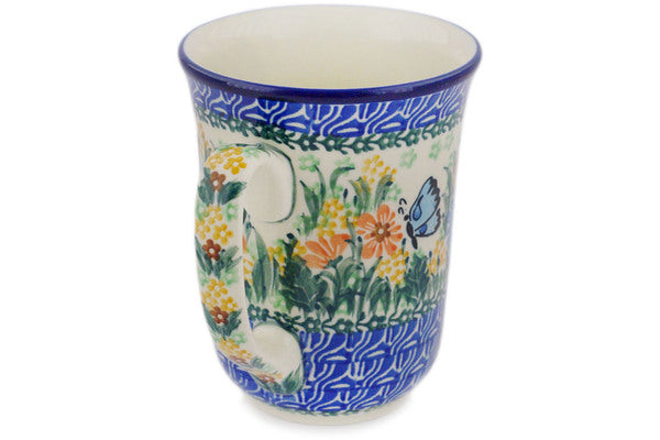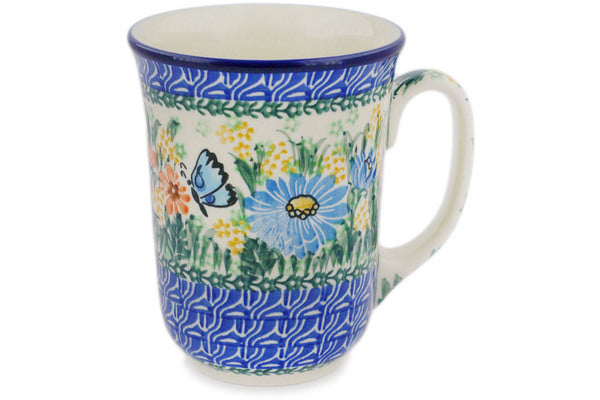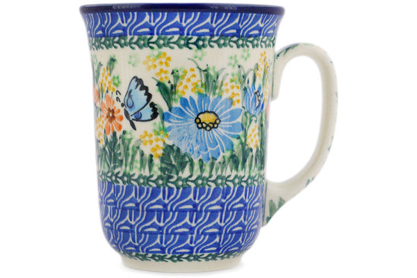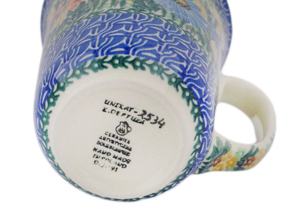This Polish pottery Mug is made by Ceramika Artystyczna workshop in Boleslawiec, Poland. Manufacturer item number H7978Q. It is 5" high and measures 5" by 4". The capacity of this Mug is 17.4 oz when filled to rim and it weighs 1.1 lbs. The pattern was designed by artist Krystyna Deptuła. It is part of the Butterfly Love Collection.
