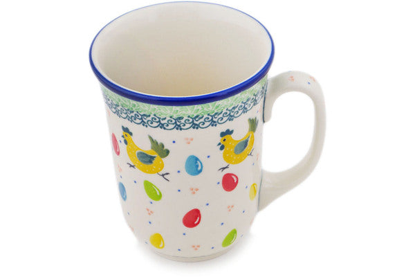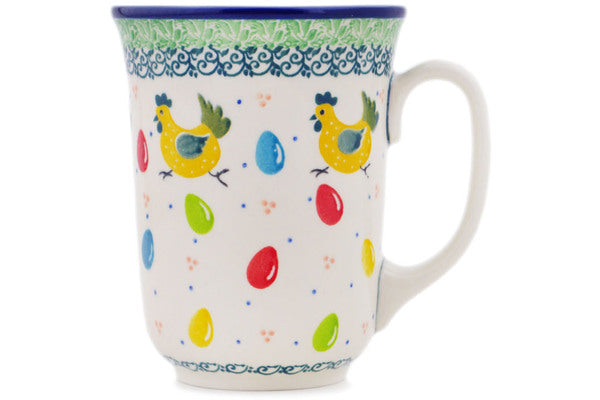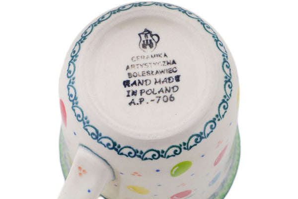 This Polish pottery Mug is made by Ceramika Artystyczna workshop in Boleslawiec, Poland. Manufacturer item number H9104Q. It is 5" high and measures 5" by 4". The capacity of this Mug is 17.4 oz when filled to rim and it weighs 1.1 lbs. It is part of the Egg Hunt Collection.