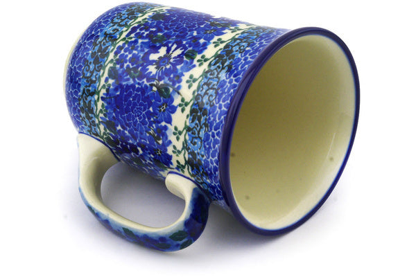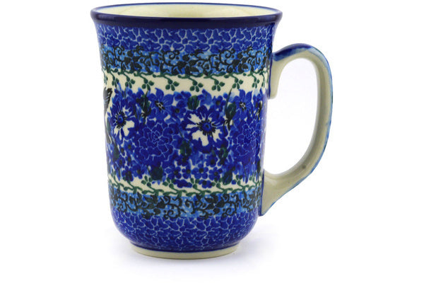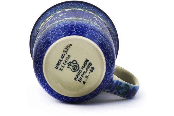 This Polish pottery Mug is made by Ceramika Artystyczna workshop in Boleslawiec, Poland. Manufacturer item number H4053E. It is 5" high and measures 5" by 4". The capacity of this Mug is 17.4 oz when filled to rim and it weighs 1.1 lbs. The pattern was designed by artist Teresa Liana. It is part of the Hummingbird Blue Collection.