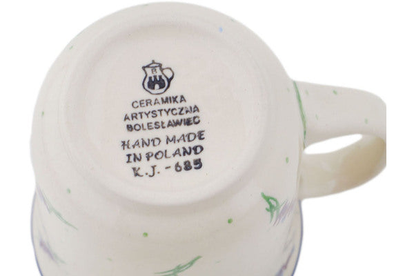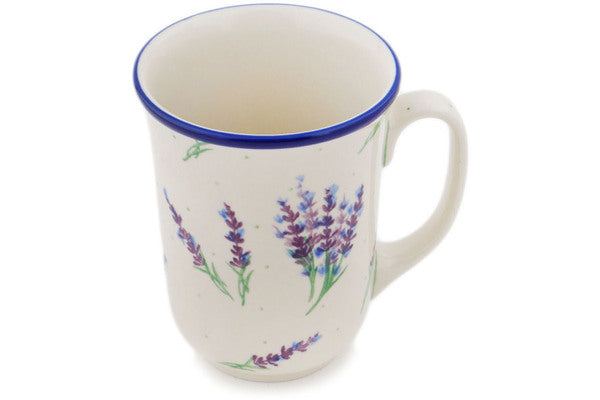 This Polish pottery Mug is made by Ceramika Artystyczna workshop in Boleslawiec, Poland. Manufacturer item number H4345Q. It is 5" high and measures 5" by 4". The capacity of this Mug is 17.4 oz when filled to rim and it weighs 1.1 lbs. It is part of the Lavish Lavender Collection.