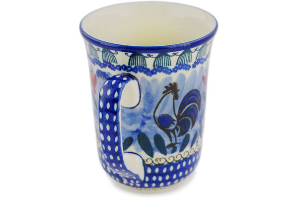 This Polish pottery Mug is made by Ceramika Artystyczna workshop in Boleslawiec, Poland. Manufacturer item number H7855Q. It is 5" high and measures 5" by 4". The capacity of this Mug is 17.4 oz when filled to rim and it weighs 1.1 lbs. The pattern was designed by artist Monika Kuczyńska. It is part of the Midnight Rooster Collection.