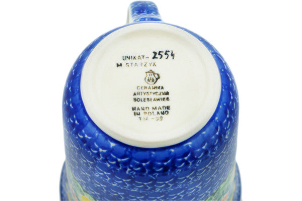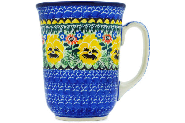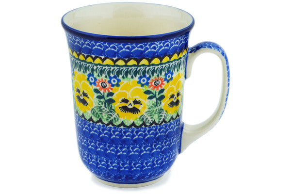 This Polish pottery Mug is made by Ceramika Artystyczna workshop in Boleslawiec, Poland. Manufacturer item number H4018L. It is 5" high and measures 5" by 4". The capacity of this Mug is 17.4 oz when filled to rim and it weighs 1.1 lbs. The pattern was designed by artist Maria Starzyk. It is part of the Pansies Field Collection.