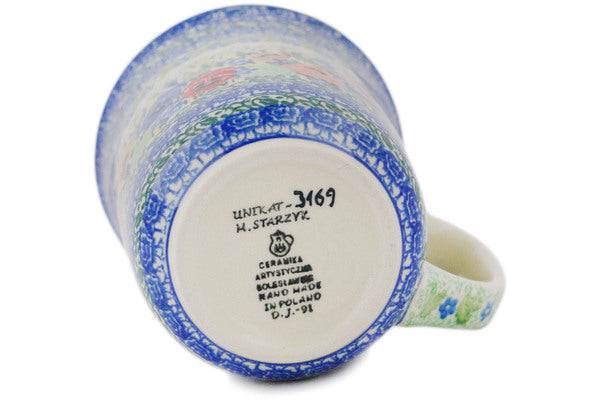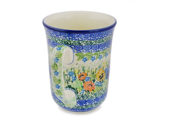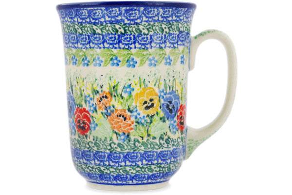 This Polish pottery Mug is made by Ceramika Artystyczna workshop in Boleslawiec, Poland. Manufacturer item number H8027Q. It is 5" high and measures 5" by 4". The capacity of this Mug is 17.4 oz when filled to rim and it weighs 1.1 lbs. The pattern was designed by artist Maria Starzyk. It is part of the Pansy Dance Collection.