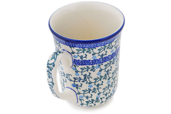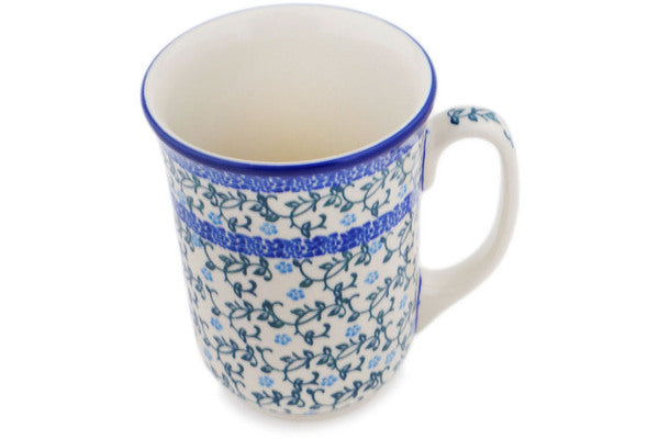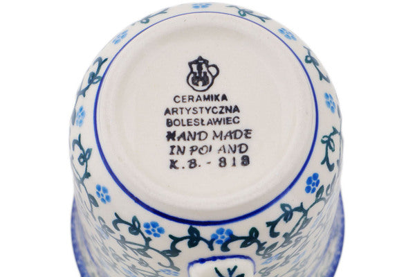 This Polish pottery Mug is made by Ceramika Artystyczna workshop in Boleslawiec, Poland. Manufacturer item number H5668Q. It is 5" high and measures 5" by 4". The capacity of this Mug is 17.4 oz when filled to rim and it weighs 1.1 lbs. The pattern was designed by artist Maria Starzyk. It is part of the Petite Blue Vine Collection.