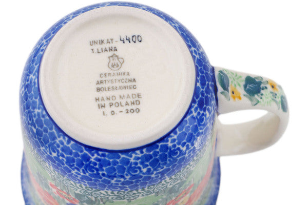 This Polish pottery Mug is made by Ceramika Artystyczna workshop in Boleslawiec, Poland. Manufacturer item number H6848Q. It is 5" high and measures 5" by 4". The capacity of this Mug is 17.4 oz when filled to rim and it weighs 1.1 lbs. The pattern was designed by artist Teresa Liana. It is part of the Splendid Meadow Collection.