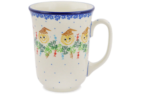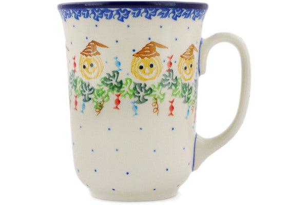 This Polish pottery Mug is made by Ceramika Artystyczna workshop in Boleslawiec, Poland. Manufacturer item number H3382R. It is 5" high and measures 5" by 4". The capacity of this Mug is 17.4 oz when filled to rim and it weighs 1.1 lbs. The pattern was designed by artist Wirginia Cebrowska. It is part of the Trick Or Treat Collection.