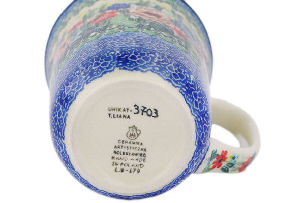 This Polish pottery Mug is made by Ceramika Artystyczna workshop in Boleslawiec, Poland. Manufacturer item number H4026R. It is 5" high and measures 5" by 4". The capacity of this Mug is 17.4 oz when filled to rim and it weighs 1.1 lbs.