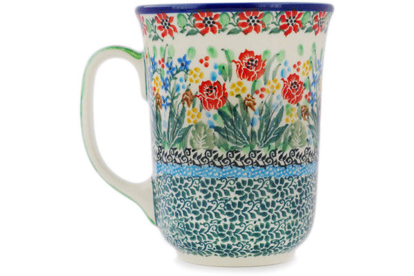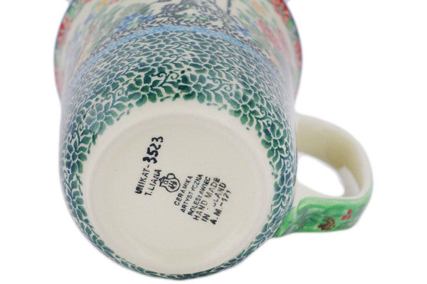 This Polish pottery Mug is made by Ceramika Artystyczna workshop in Boleslawiec, Poland. Manufacturer item number H8078Q. It is 5" high and measures 5" by 4". The capacity of this Mug is 17.4 oz when filled to rim and it weighs 1.1 lbs. The pattern was designed by artist Teresa Liana. It is part of the Windmill Meadow Collection.