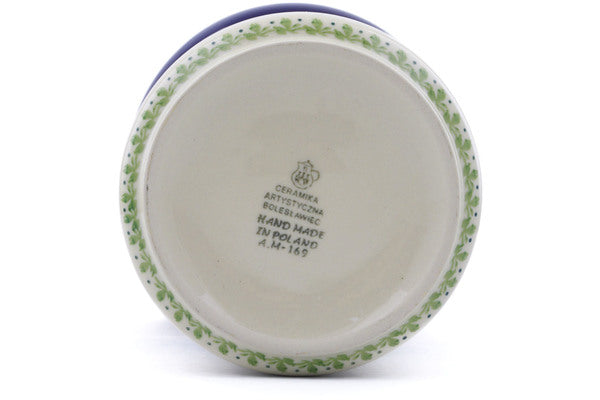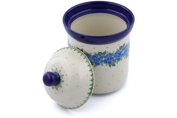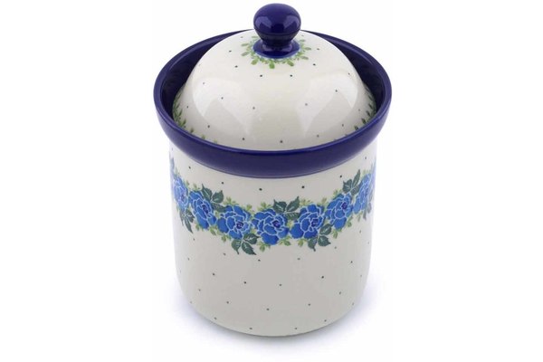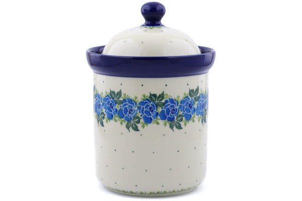 This Polish pottery Jar with Lid is made by Ceramika Artystyczna workshop in Boleslawiec, Poland. Manufacturer item number H1165J. It is 8¼" high and measures 4¾" by 4¾". The capacity of this Jar with Lid is 43.9 oz when filled to rim and it weighs 2.3 lbs. It is part of the Blue Rose Collection.