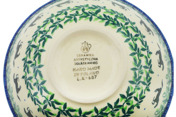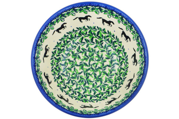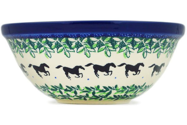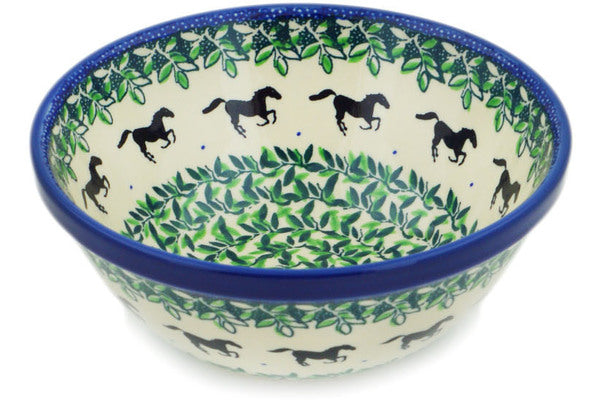 This Polish pottery Bowl is made by Ceramika Artystyczna workshop in Boleslawiec, Poland. Manufacturer item number H8190L. It is 2¾" high and measures 6½" by 6½". The capacity of this Bowl is 24.0 oz when filled to rim and it weighs 1.2 lbs. It is part of the Mustang Forest Collection.