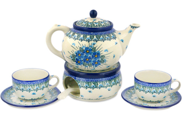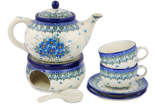 This Polish pottery Tea or Coffee Set for Two is made by Ceramika Artystyczna workshop in Boleslawiec, Poland. Manufacturer item number H3472R. It is 8¾" high and measures 9½" by 6". The capacity of this Tea or Coffee Set for Two is 40.6 oz when filled to rim and it weighs 4.7 lbs. The pattern was designed by artist MARIA STARZYK. It is part of the Forget Me Not Collection.