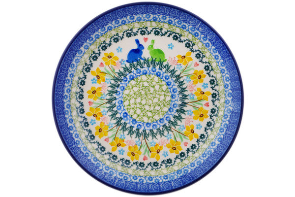 This Polish pottery Plate is made by Ceramika Artystyczna workshop in Boleslawiec, Poland. Manufacturer item number H9040Q. It is 1¼" high and measures 8" by 8". The weight of this Plate is 1.0 lbs. It is part of the Hopping In Love Collection.