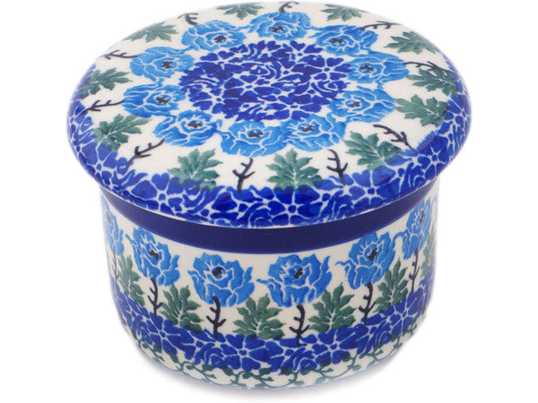 This Polish pottery Butter Dish is made by Ceramika Artystyczna workshop in Boleslawiec, Poland. Manufacturer item number H5577Q. It is 3" high and measures 4½" by 4½". The weight of this Butter Dish is 1.3 lbs. The pattern was designed by artist Teresa Liana. It is part of the Blue Rosette Wreath Collection.
