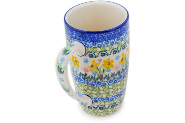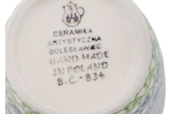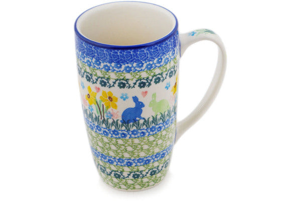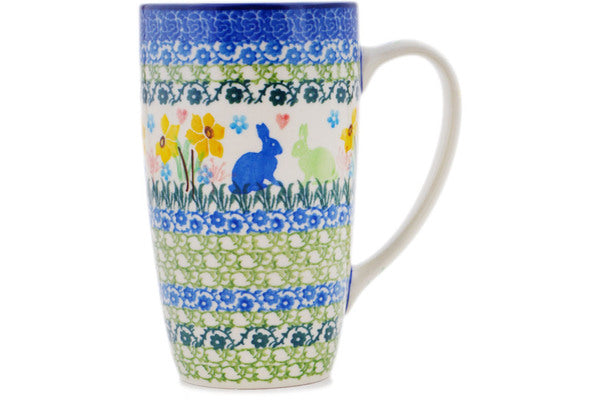 This Polish pottery Mug is made by Ceramika Artystyczna workshop in Boleslawiec, Poland. Manufacturer item number H9031Q. It is 5¼" high and measures 4¾" by 3¼". The capacity of this Mug is 14.3 oz when filled to rim and it weighs 1.0 lbs. It is part of the Hopping In Love Collection.