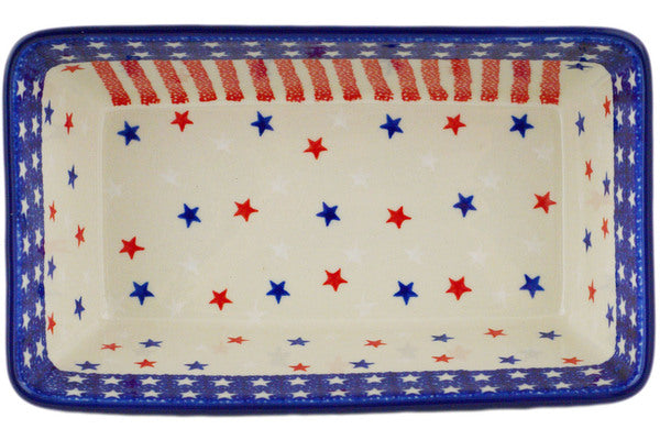 This Polish pottery Rectangular Baker is made by Ceramika Artystyczna workshop in Boleslawiec, Poland. Manufacturer item number H2742R. It is 3" high and measures 8" by 5". The capacity of this Rectangular Baker is 36.3 oz when filled to rim and it weighs 1.9 lbs. It is part of the American Stars And Stripes Collection.