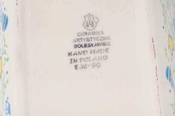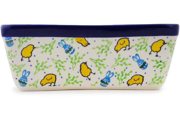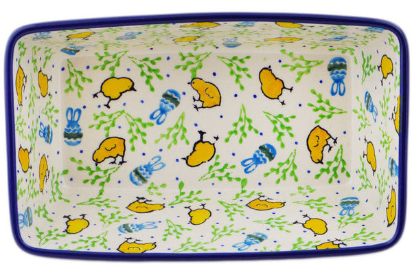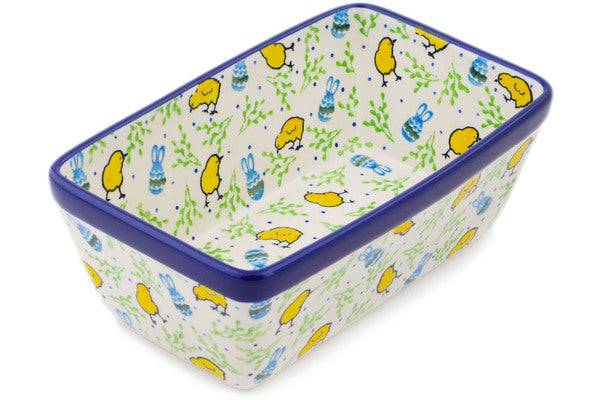 This Polish pottery Rectangular Baker is made by Ceramika Artystyczna workshop in Boleslawiec, Poland. Manufacturer item number H1372R. It is 3" high and measures 8" by 5". The capacity of this Rectangular Baker is 36.3 oz when filled to rim and it weighs 1.9 lbs. It is part of the Easter Day Collection.