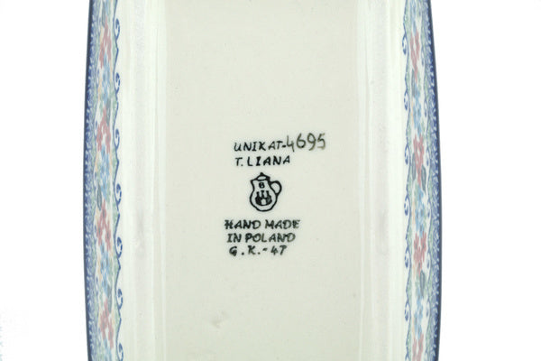This Polish pottery Rectangular Baker is made by Ceramika Artystyczna workshop in Boleslawiec, Poland. Manufacturer item number H8860H. It is 3" high and measures 8" by 5". The capacity of this Rectangular Baker is 36.3 oz when filled to rim and it weighs 1.9 lbs. The pattern was designed by artist Teresa Liana. It is part of the Motherland Garden Collection.