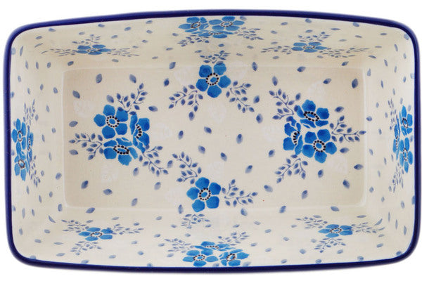 This Polish pottery Rectangular Baker is made by Ceramika Artystyczna workshop in Boleslawiec, Poland. Manufacturer item number H4976P. It is 3" high and measures 8" by 5". The capacity of this Rectangular Baker is 36.3 oz when filled to rim and it weighs 1.9 lbs. It is part of the Winter Wonderland Collection.