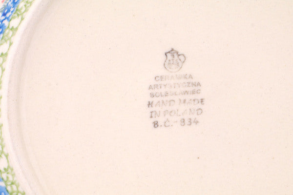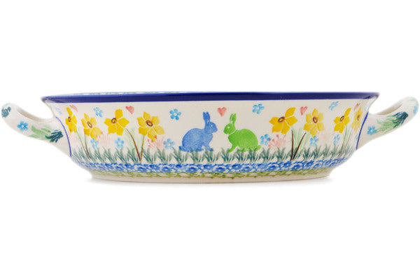 This Polish pottery Round Baker with Handles is made by Ceramika Artystyczna workshop in Boleslawiec, Poland. Manufacturer item number H9034Q. It is 2¼" high and measures 10" by 8¼". The capacity of this Round Baker with Handles is 25.4 oz when filled to rim and it weighs 1.8 lbs. It is part of the Hopping In Love Collection.