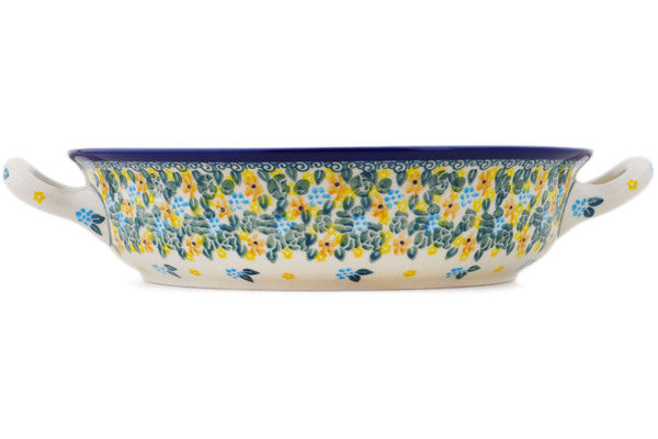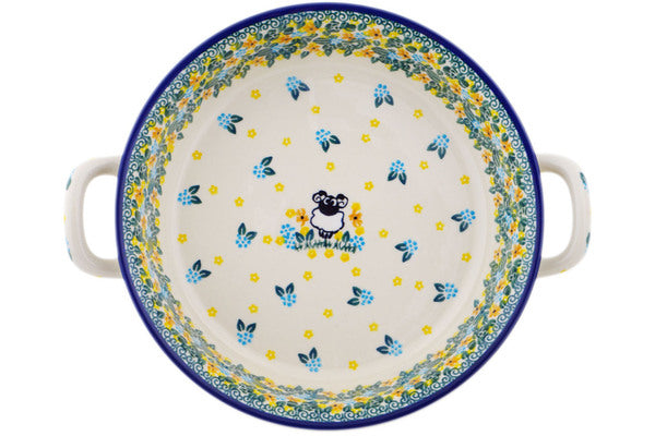 This Polish pottery Round Baker with Handles is made by Ceramika Artystyczna workshop in Boleslawiec, Poland. Manufacturer item number H9324Q. It is 2¼" high and measures 10" by 8¼". The capacity of this Round Baker with Handles is 25.4 oz when filled to rim and it weighs 1.8 lbs. It is part of the Sheep In The Meadow Collection.