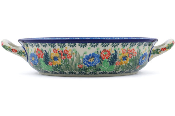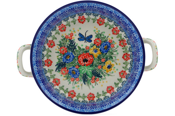 This Polish pottery Round Baker with Handles is made by Ceramika Artystyczna workshop in Boleslawiec, Poland. Manufacturer item number H3542I. It is 2¼" high and measures 10" by 8¼". The capacity of this Round Baker with Handles is 25.4 oz when filled to rim and it weighs 1.8 lbs. The pattern was designed by artist Teresa Liana. It is part of the Splendid Dragonfly Collection.