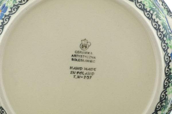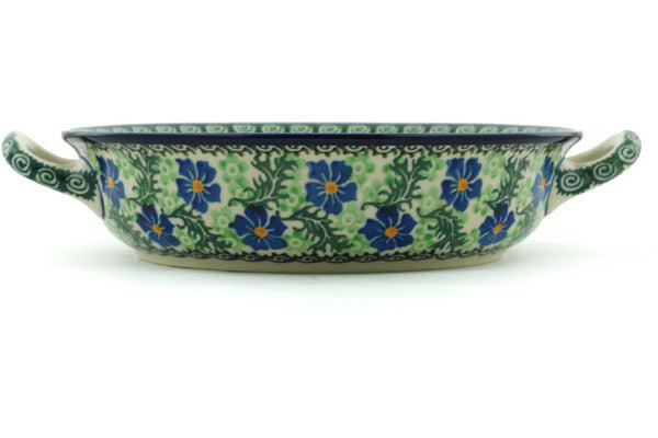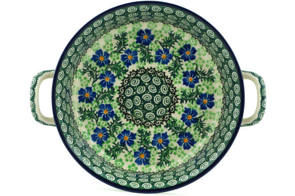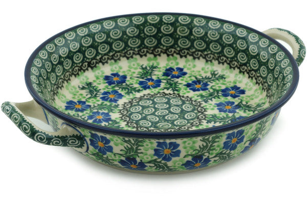 This Polish pottery Round Baker with Handles is made by Ceramika Artystyczna workshop in Boleslawiec, Poland. Manufacturer item number H8979H. It is 2¼" high and measures 10" by 8¼". The capacity of this Round Baker with Handles is 25.4 oz when filled to rim and it weighs 1.8 lbs. The pattern was designed by artist Teresa Nakonieczna. It is part of the Swirling Emeralds Collection.