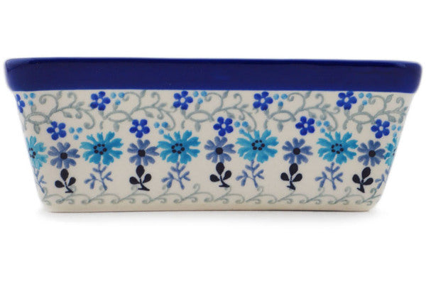 This Polish pottery Rectangular Baker is made by Ceramika Artystyczna workshop in Boleslawiec, Poland. Manufacturer item number H6439Q. It is 2¼" high and measures 6¼" by 3¾". The capacity of this Rectangular Baker is 14.1 oz when filled to rim and it weighs 1.0 lbs. It is part of the Baby Blue Garden Collection.