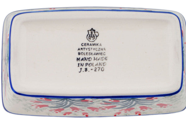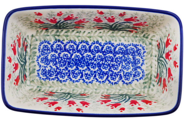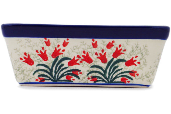This Polish pottery Rectangular Baker is made by Ceramika Artystyczna workshop in Boleslawiec, Poland. Manufacturer item number H5426Q. It is 2¼" high and measures 6¼" by 3¾". The capacity of this Rectangular Baker is 14.1 oz when filled to rim and it weighs 1.0 lbs. The pattern was designed by artist Jolanta Okraska. It is part of the Crimson Bells Collection.