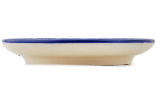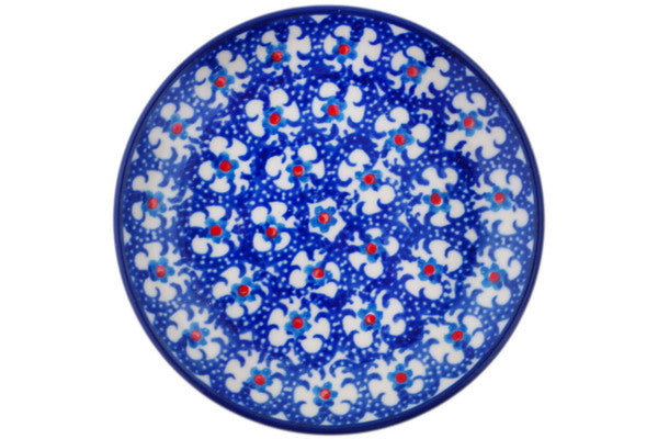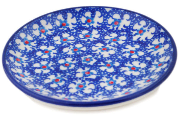 This Polish pottery Plate is made by Ceramika Artystyczna workshop in Boleslawiec, Poland. Manufacturer item number H3211B. It is ¾" high and measures 4" by 4". The weight of this Plate is 0.3 lbs. The pattern was designed by artist Paweł Jarczyński. It is part of the Ribbon Daisies Collection.