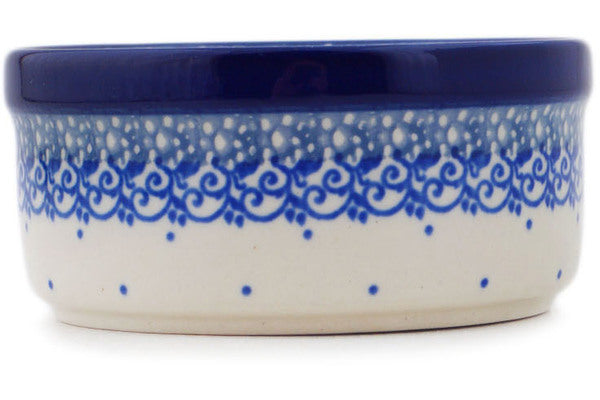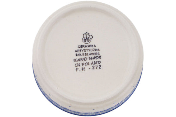 This Polish pottery Bowl is made by Ceramika Artystyczna workshop in Boleslawiec, Poland. Manufacturer item number H6320Q. It is 1¾" high and measures 3¾" by 3¾". The capacity of this Bowl is 6.8 oz when filled to rim and it weighs 0.5 lbs. It is part of the Cobalt Hen Collection.