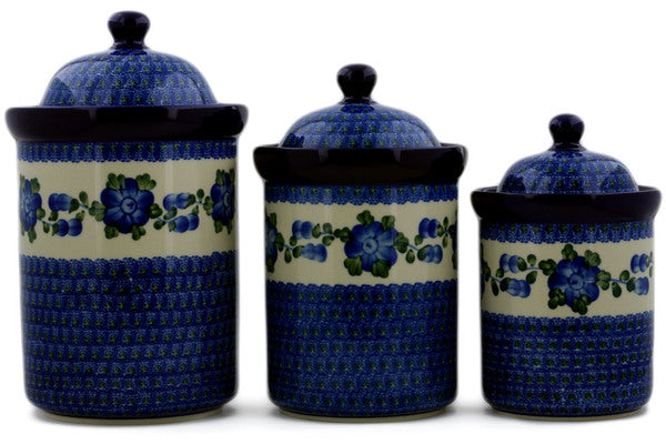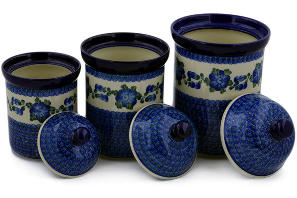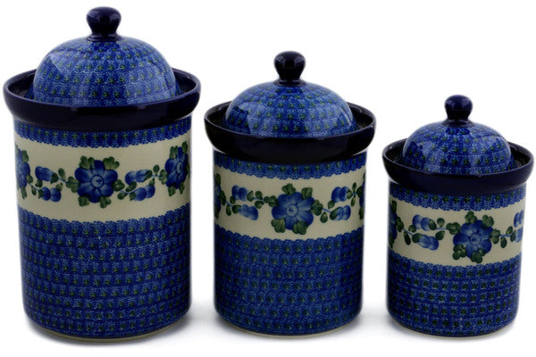 Polish Pottery Set of 3 Canisters with Lids Blue Poppies