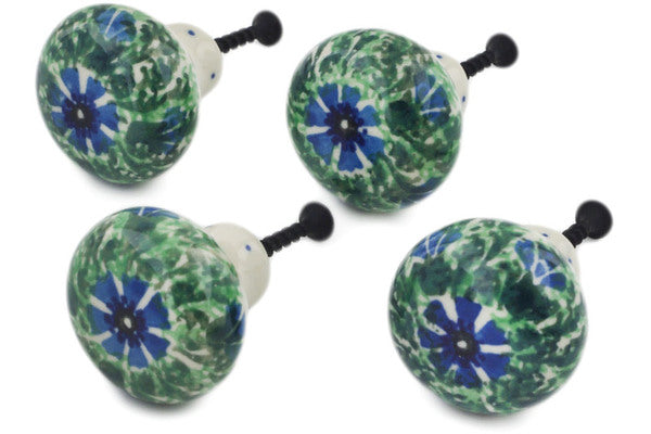 This Polish pottery Set of 4 Drawer Pull Knobs is made by Ceramika Artystyczna workshop in Boleslawiec, Poland. Manufacturer item number H3438L. It is 1½" high and measures 1½" by 1½". The weight of this Set of 4 Drawer Pull Knobs is 0.4 lbs. The pattern was designed by artist Janina Pałka. It is part of the Polish Wreath Collection.