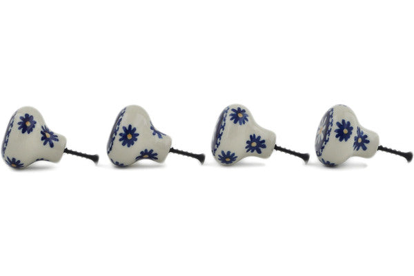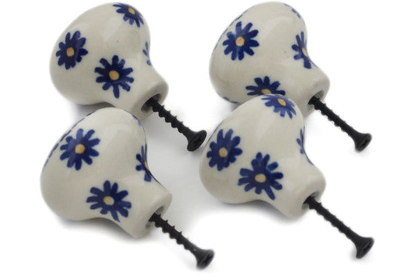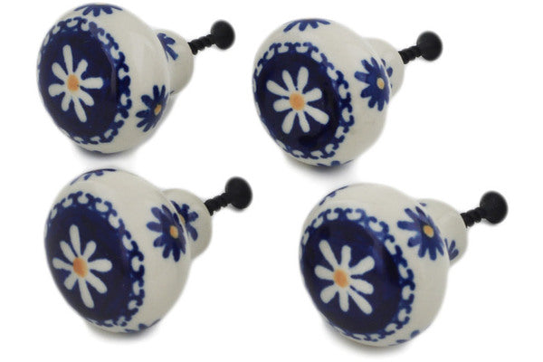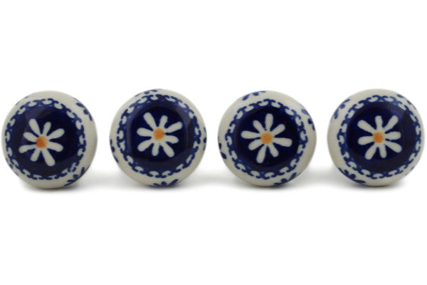 This Polish pottery Set of 4 Drawer Pull Knobs is made by Ceramika Artystyczna workshop in Boleslawiec, Poland. Manufacturer item number H3432L. It is 1½" high and measures 1½" by 1½". The weight of this Set of 4 Drawer Pull Knobs is 0.4 lbs. The pattern was designed by artist Anna Fryc. It is part of the Sweet Daisy Collection.