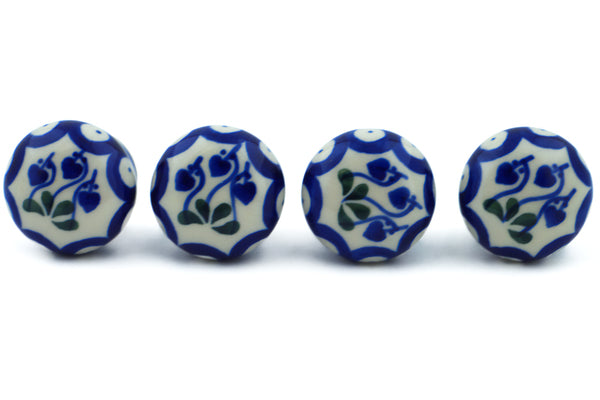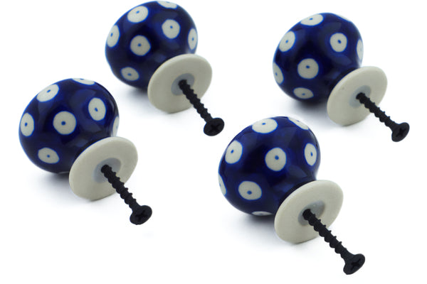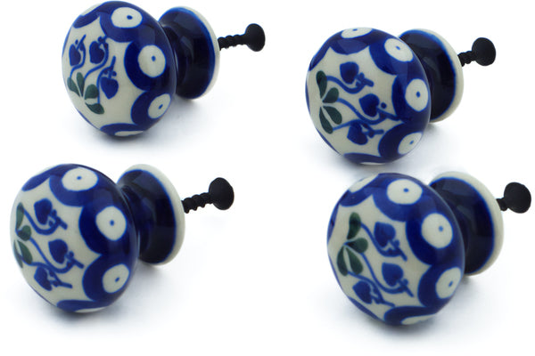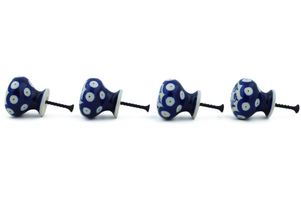 This Polish pottery Set of 4 Drawer Pull Knobs is made by Ceramika Artystyczna workshop in Boleslawiec, Poland. Manufacturer item number H8106N. It is 1½" high and measures 1½" by 1½". The weight of this Set of 4 Drawer Pull Knobs is 0.1 lbs. The pattern was designed by artist Maria Ciszewska. It is part of the Bleeding Heart Peacock Collection.