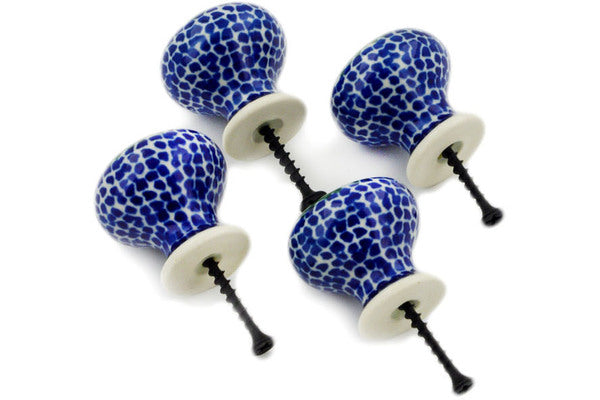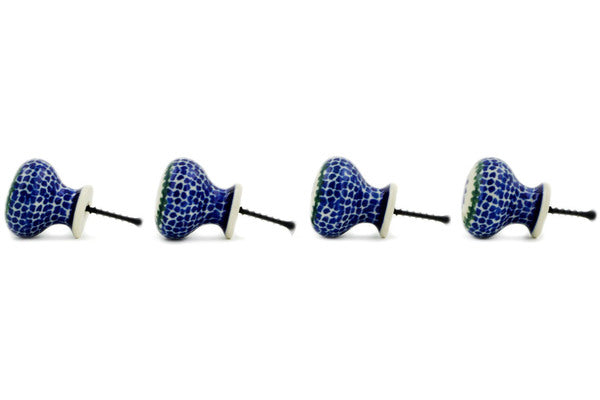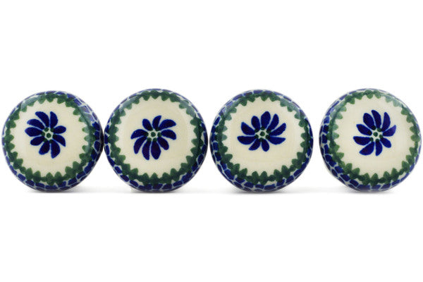 This Polish pottery Set of 4 Drawer Pull Knobs is made by Ceramika Artystyczna workshop in Boleslawiec, Poland. Manufacturer item number H3661M. It is 1½" high and measures 1½" by 1½". The weight of this Set of 4 Drawer Pull Knobs is 0.1 lbs. It is part of the Polka Dot Daisy Collection.