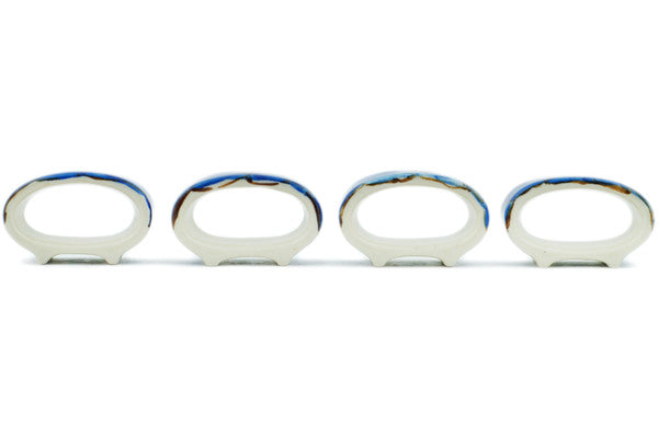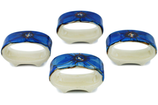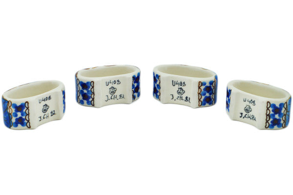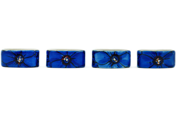 This Polish pottery Set of 4 Napkin Rings is made by Ceramika Artystyczna workshop in Boleslawiec, Poland. Manufacturer item number H9273N. It is 1½" high and measures 2¼" by 1". The weight of this Set of 4 Napkin Rings is 0.1 lbs. The pattern was designed by artist Jacek Chyla. It is part of the Cobalt Poppies Collection.