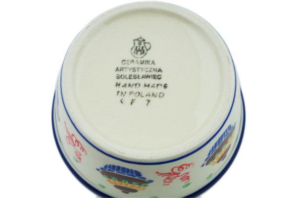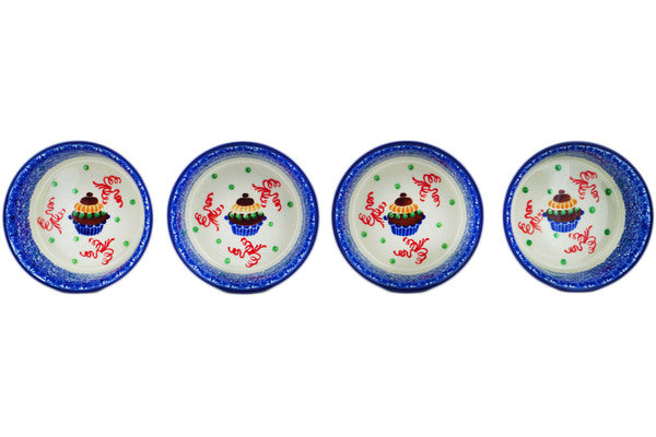 This Polish pottery Set of 4 Bowls is made by Ceramika Artystyczna workshop in Boleslawiec, Poland. Manufacturer item number H8666N. It is 2" high and measures 3¾" by 3¾". The capacity of this Set of 4 Bowls is 6.4 oz when filled to rim and it weighs 0.4 lbs. It is part of the Birthday Cupcakes Collection.