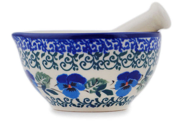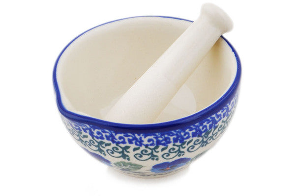 Polish Pottery Small Mortar and Pestle Blue Pansy