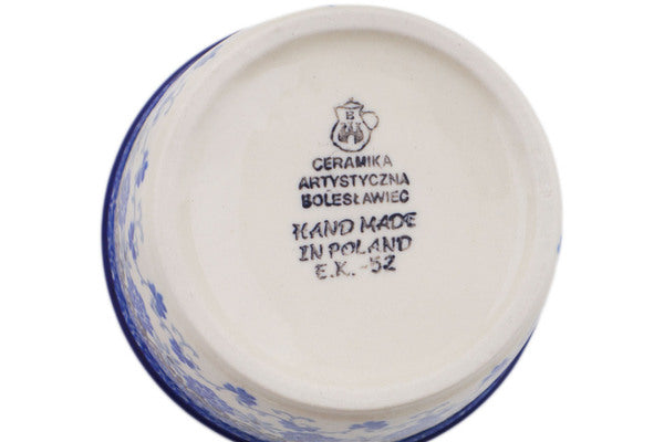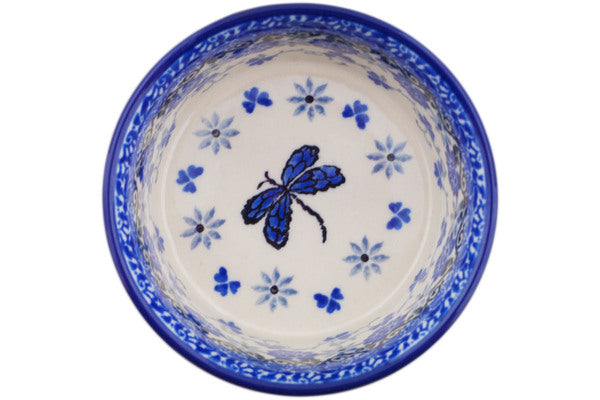 This Polish pottery Bowl is made by Ceramika Artystyczna workshop in Boleslawiec, Poland. Manufacturer item number H5908Q. It is 2" high and measures 3¾" by 3¾". The capacity of this Bowl is 6.4 oz when filled to rim and it weighs 0.4 lbs. It is part of the Spring Dragonfly Collection.