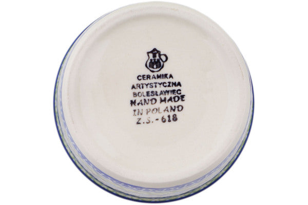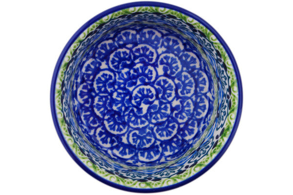 This Polish pottery Bowl is made by Ceramika Artystyczna workshop in Boleslawiec, Poland. Manufacturer item number H5694Q. It is 2" high and measures 3¾" by 3¾". The capacity of this Bowl is 6.4 oz when filled to rim and it weighs 0.4 lbs. The pattern was designed by artist Maria Starzyk. It is part of the Artistic Boho Collection.