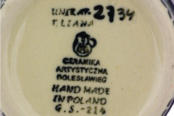 This Polish pottery Bowl is made by Ceramika Artystyczna workshop in Boleslawiec, Poland. Manufacturer item number H8458I. It is 2" high and measures 3¾" by 3¾". The capacity of this Bowl is 6.4 oz when filled to rim and it weighs 0.4 lbs. The pattern was designed by artist Teresa Liana. It is part of the Mallard Meadow Collection.